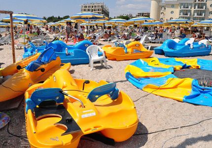 На пляже вы сможете арендовать катамараны, водный скутер и многое другое.